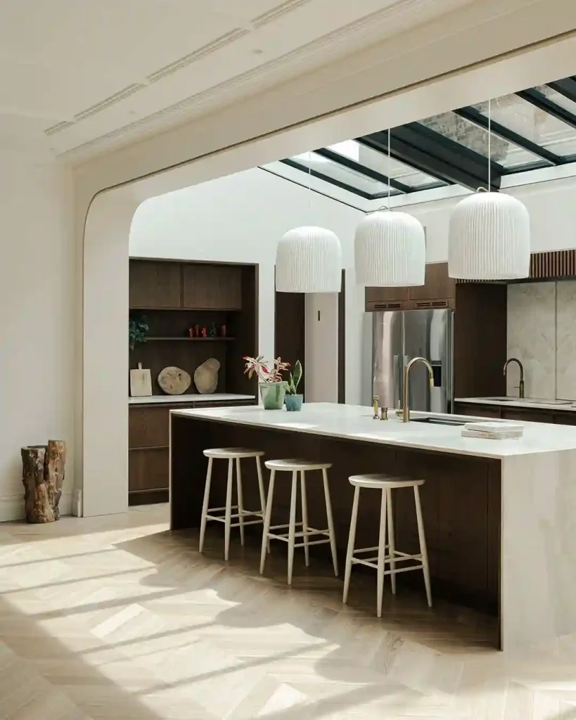 This kitchen makes the most of its stunning skylight, flooding the room with sunlight. The dark wood base and open shelves add a touch of depth, while the crisp white countertops and stools keep the space bright. The ribbed pendant lights add texture without overpowering the calm look. With its open design and earthy accents, this kitchen invites you to slow down and enjoy the moment.