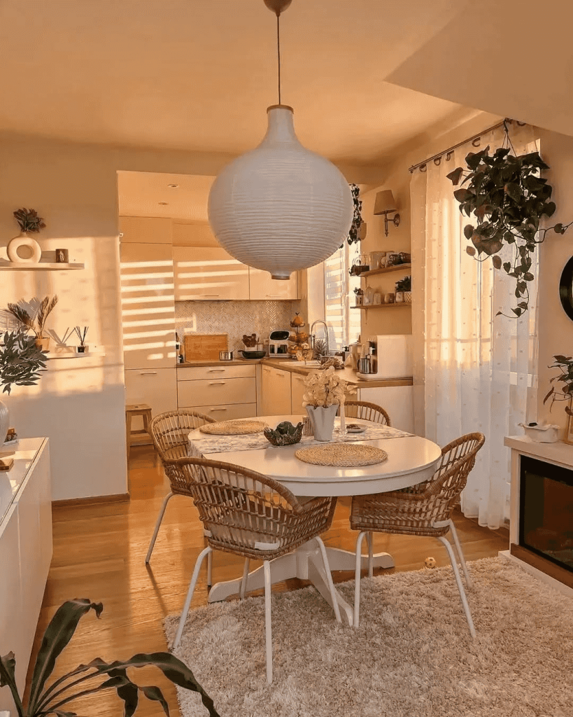 Bathed in golden hour light, this kitchen feels like a cozy hug. The round dining table with rattan chairs keeps the vibe easy and relaxed. Natural wood tones, floating shelves, and a neutral rug work together to make the space warm without clutter. A big globe pendant light adds a fun twist. The whole room feels like it was made for slow mornings and long chats over tea.
