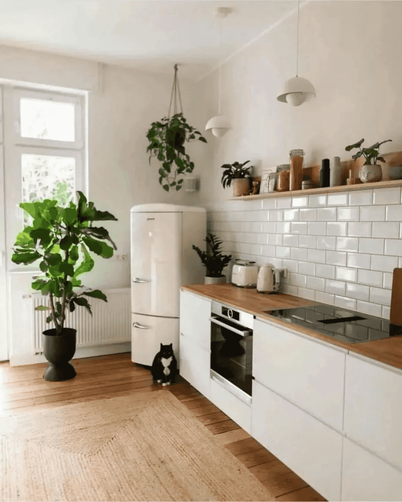 This space feels calm and lived-in, thanks to warm wooden floors, a cozy rug, and plenty of greenery. The white cabinets paired with a light wood countertop keep the design grounded yet fresh. Plants on the shelves and a hanging one by the fridge bring in that signature Scandinavian connection to nature. And the soft morning light filtering through makes it feel like a little retreat right in your home. Even the cat seems to love it here!