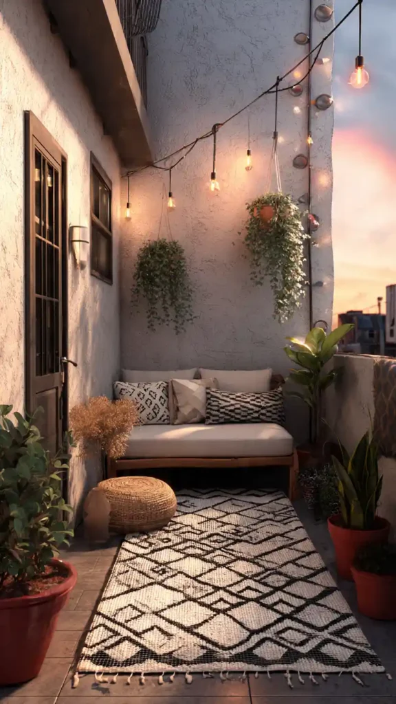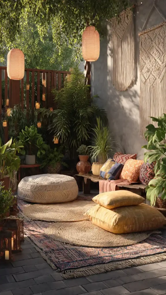Boho style brings warmth and texture. Layer outdoor rugs, floor cushions, and woven accents with plenty of potted plants. Keep colors soft and natural rather than overly bold. Lantern lighting adds atmosphere at night. Because furniture is low-profile, the space still feels open even with multiple decor pieces.