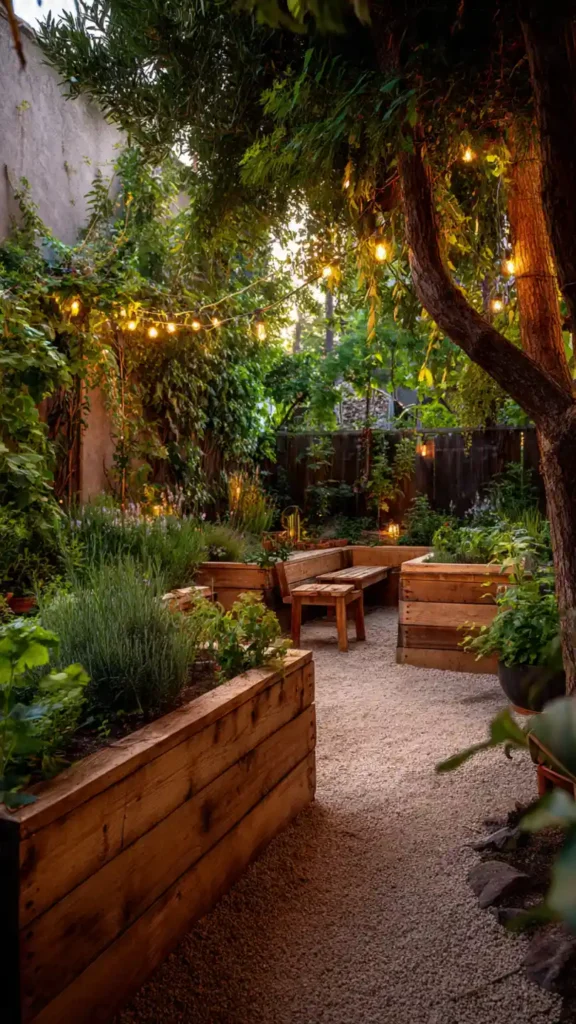 A gravel pathway instantly makes a small backyard feel organized and inviting. Instead of grass taking up space, light pea gravel creates clean walking lines while keeping maintenance low. In this setup, the path gently curves between raised wooden beds filled with soft greenery and seasonal blooms. A simple wooden bench tucked along the edge adds a cozy place to sit, especially when paired with warm string lights overhead. The texture of gravel, wood, and plants layered together gives the space a relaxed, cottage-style charm without feeling crowded.