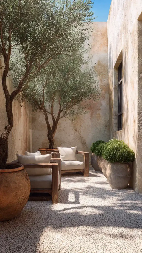 A rustic look works beautifully in compact spaces. Use weathered wood planters, galvanized metal tubs for flowers, and natural stone accents. Keep the color palette earthy with greens, whites, and soft neutrals. A simple wooden bench or farmhouse-style chair completes the setup. This style feels relaxed and homey without needing many decorative pieces.