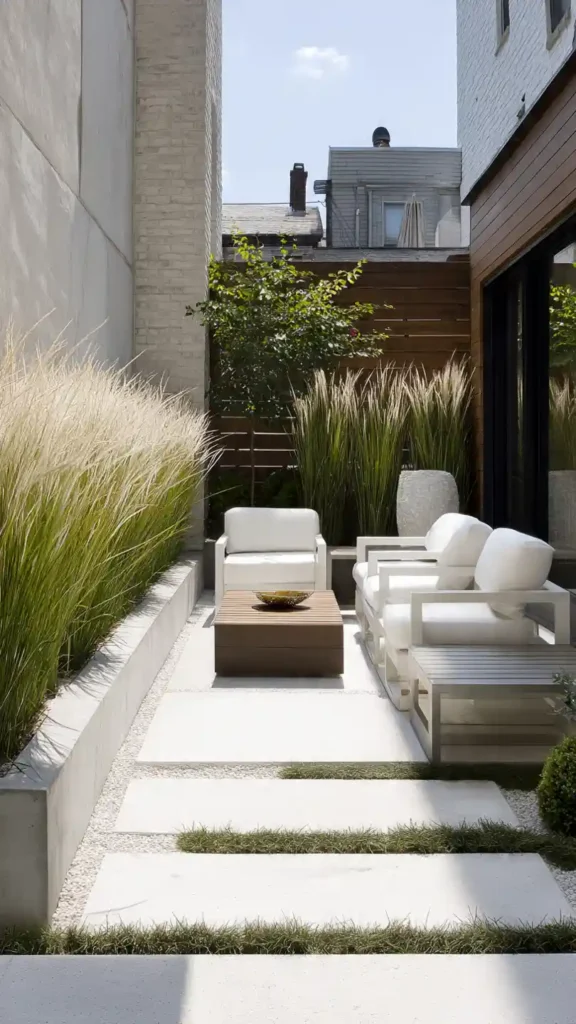 Clean lines work beautifully in small spaces. Use rectangular planter boxes, ornamental grasses, and a neutral color palette to create structure. Concrete pavers or smooth stone flooring make the yard feel larger visually. Keep furniture sleek and low-profile. Instead of many plant varieties, stick to two or three for a calm, organized feel. This approach makes a small backyard feel intentional and spacious.