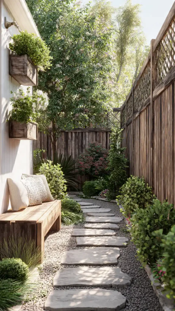 Side yards are often ignored, but they’re perfect for slim garden layouts. A stepping stone path with narrow plant beds on each side keeps movement easy while adding greenery. Wall-mounted lights make it inviting at night. Using tall, slim plants rather than wide shrubs keeps the walkway open. This is one of the most practical ways to use forgotten backyard space.