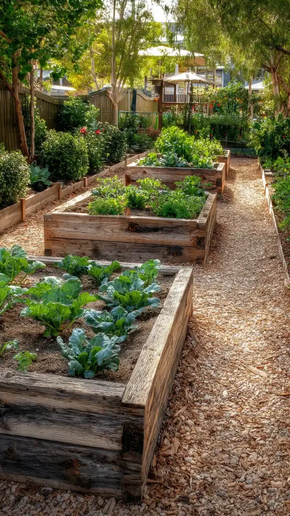 Raised beds add structure and prevent a small yard from looking messy. Arranging them in straight lines or a U-shape creates a defined layout. Use natural wood to keep the space warm and welcoming. Gravel or mulch between beds keeps maintenance low. Even if you’re growing vegetables, neat edges make the backyard feel designed rather than crowded.