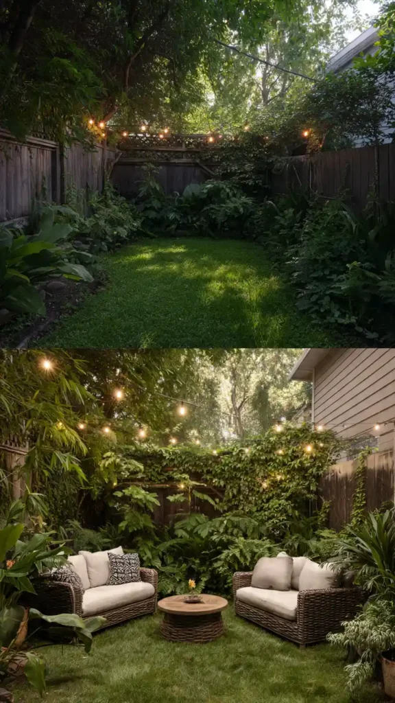 Lush tropical plants instantly change the mood of a small backyard. Large-leaf greenery like palms or banana plants create a layered look without needing many pieces. Bamboo fencing or natural wood accents add warmth. Keep seating minimal — maybe a woven chair or two so plants remain the focus. Even a tiny yard can feel like a vacation spot when greenery is bold and layered properly.