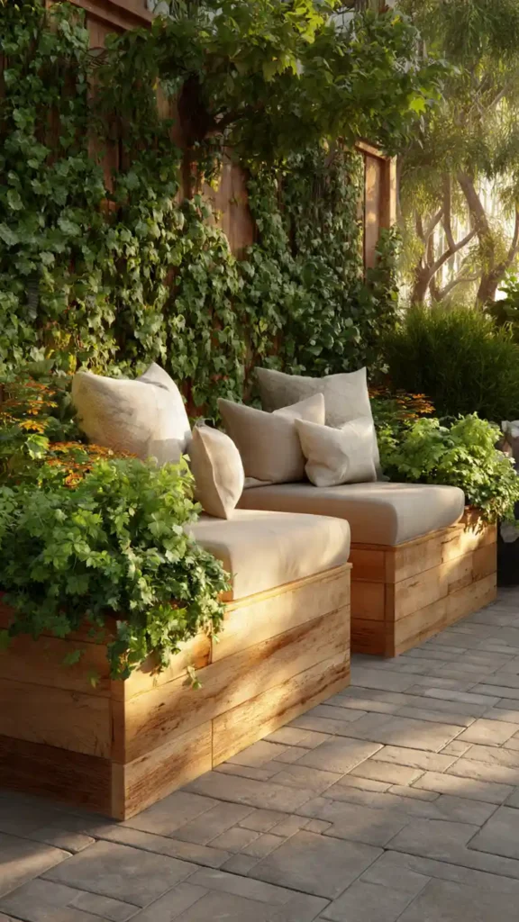 Combining seating and planting in one structure saves valuable space. A wooden bench with planter boxes on each end creates symmetry and keeps the layout clean. Use trailing greenery to soften edges and neutral cushions for comfort. This idea works particularly well in corners where traditional furniture might feel bulky.