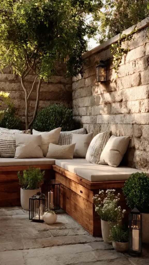 A built-in wooden bench saves space and instantly makes a small backyard feel custom designed. Instead of bulky outdoor furniture, a corner bench with hidden storage keeps things clean and practical. Surround it with layered plants — taller shrubs behind, medium greenery at the sides, and soft ground cover below. Neutral cushions keep the look calm and cozy. This setup works especially well in square or L-shaped yards where every inch matters.
