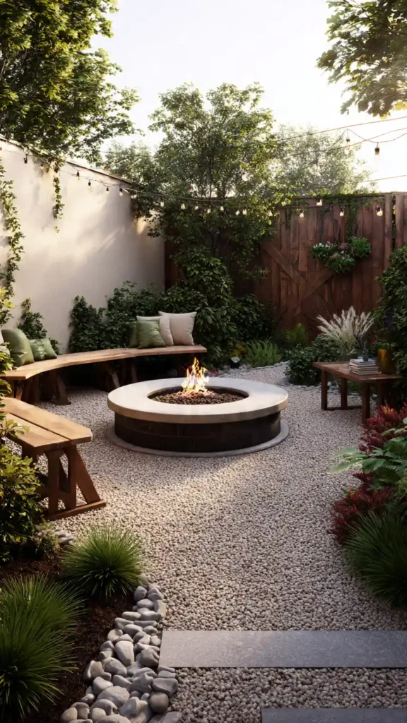 A small circular fire pit creates a strong focal point. Surround it with gravel and two or three slim chairs to avoid overcrowding. Low greenery around the edges keeps sightlines open while still adding softness. This setup works especially well in square backyards. It turns even the tiniest outdoor space into a cozy evening gathering spot.