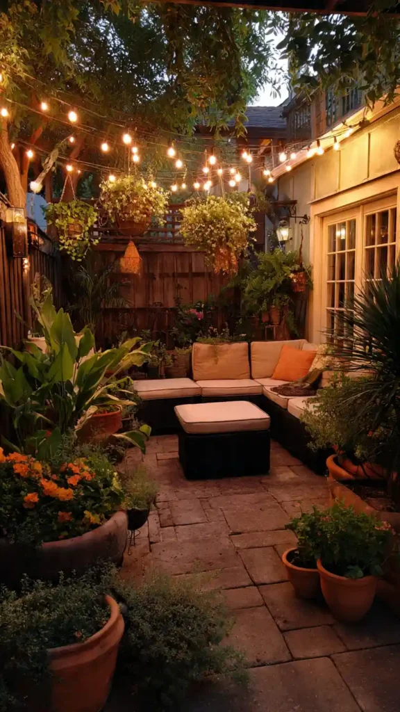 String lights instantly make a small backyard feel warm and inviting. Stretch them overhead from fence to fence to create a soft canopy effect. Keep the base simple with gravel or stone flooring and a compact seating area underneath. The glow at night adds depth and makes the space feel larger than it is. Even a very small yard feels like an outdoor lounge once lighting is layered properly.