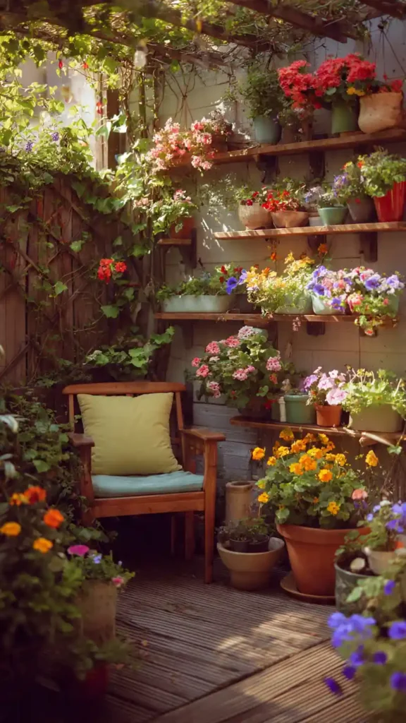 A cottage-inspired corner brings softness into a compact yard. Think climbing roses on a small trellis, layered wildflowers, and a vintage-style metal chair tucked under greenery. Slightly uneven stone or brick pathways enhance the relaxed look. The key here is abundance filling the space with blooms so it feels lush rather than empty. Even a tight backyard can feel romantic when plants are layered thoughtfully.