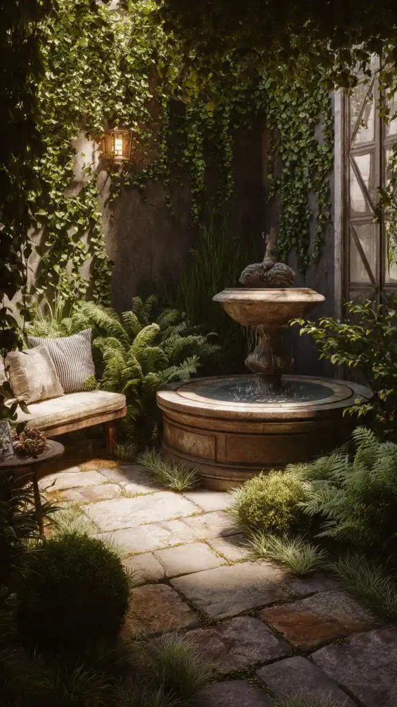 A compact fountain or small stone water bowl adds soothing sound without overwhelming the yard. Place it against a wall or in a corner surrounded by greenery. Keep nearby decor minimal so the water feature becomes the highlight. The gentle movement makes even a simple backyard feel calm and thoughtfully designed.