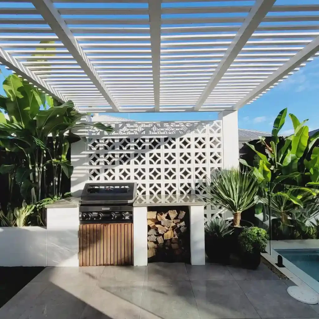 A client of mine wanted a compact BBQ zone, so we added breezeblock walls and a simple pergola for shade. The breeze through the blocks kept it airy, and the tropical plants brought life to the white-and-concrete setup. I loved how functional and pretty it turned out.