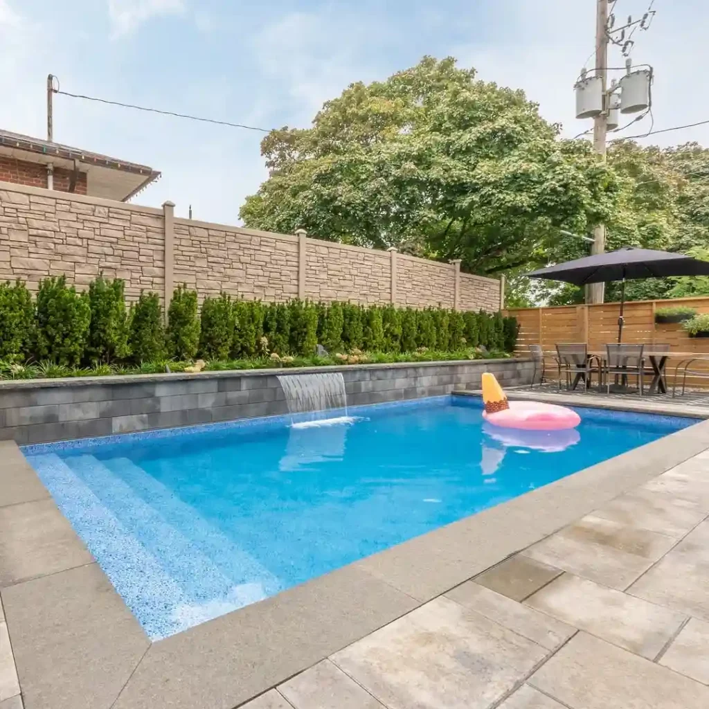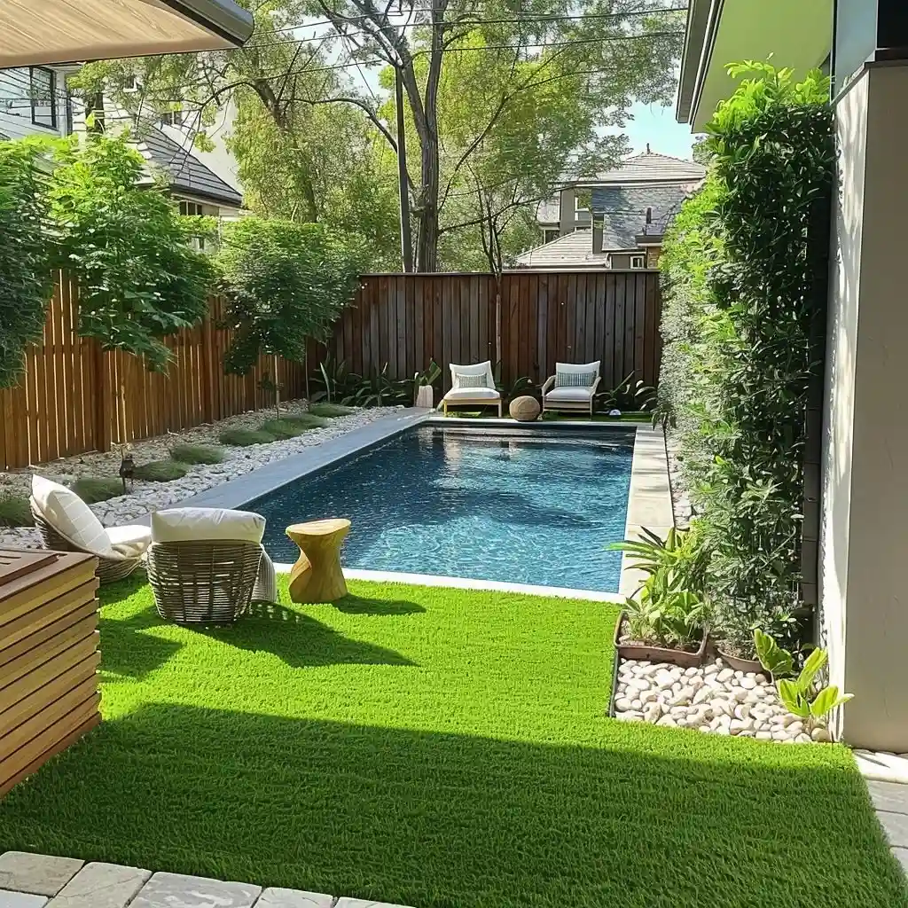 I once helped a friend transform their tiny yard with a narrow pool bordered by artificial grass. What surprised me was how the clean lines and simple loungers made the space feel bigger. Adding a wooden fence and white stone edging tied it all together — low maintenance and super chic!