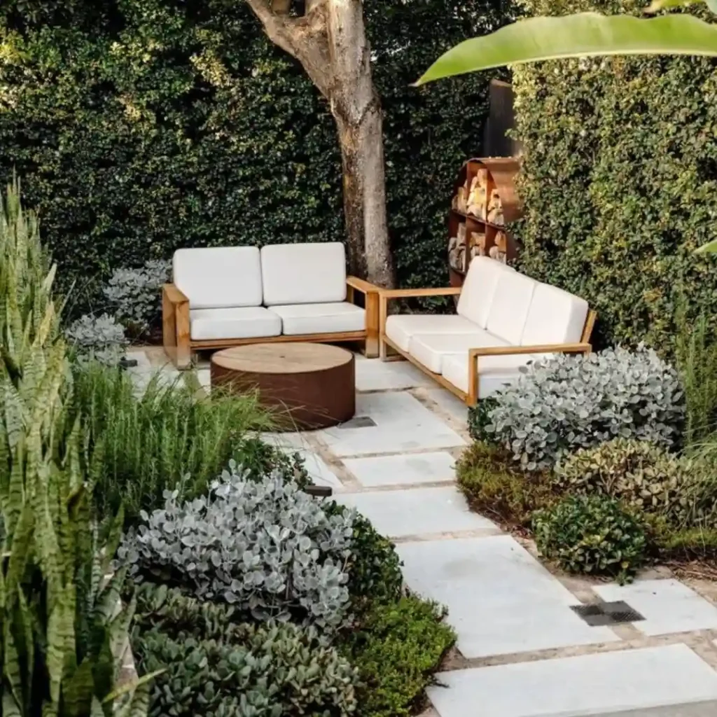 There’s something so calming about mixing wood furniture with dense greenery. In my own backyard, I added simple wood-framed sofas and let succulents and hedges take over. The rusted fire table wasn’t planned — but it ended up being the perfect rustic touch. It’s my go-to for morning coffee.