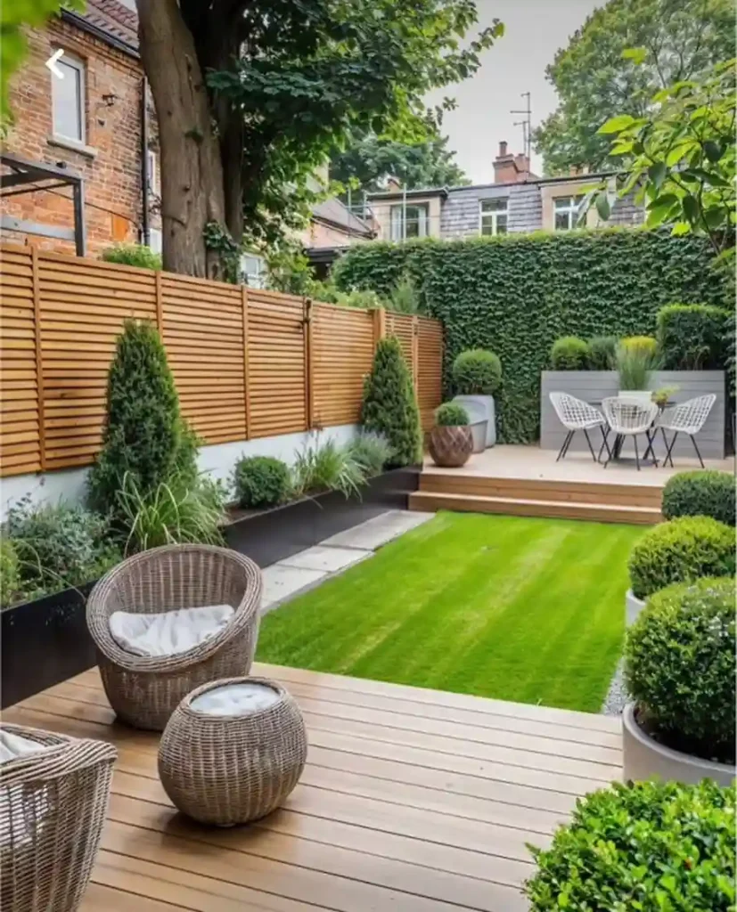 This setup came together in a tiny city yard I helped redesign. The raised deck with wicker chairs and the slim grass strip gave the area structure and softness. The modern fence panels made it feel private without closing it in.