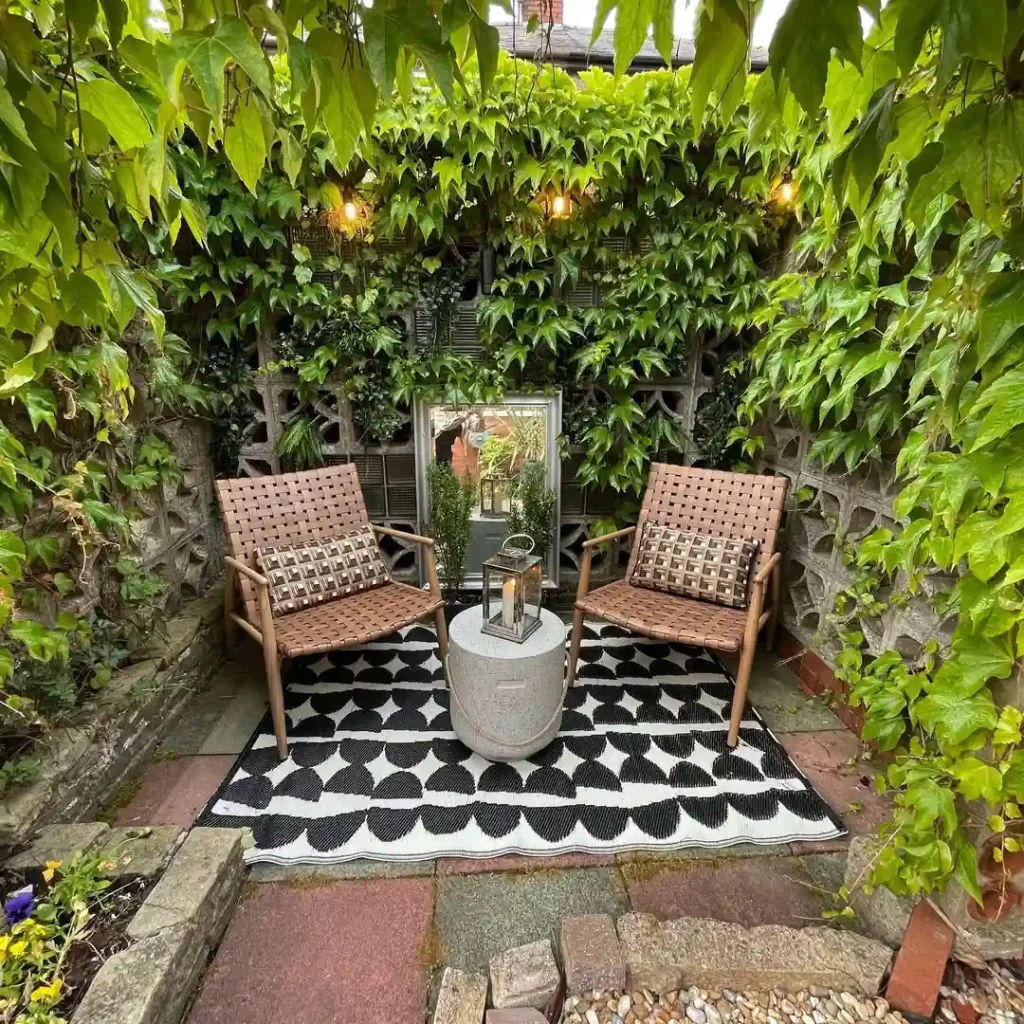 I stumbled on this look while setting up a forgotten garden corner. Two woven chairs, a bold rug, and a concrete side table turned it into my new favorite reading nook. The vines did the rest, wrapping the space in green privacy.