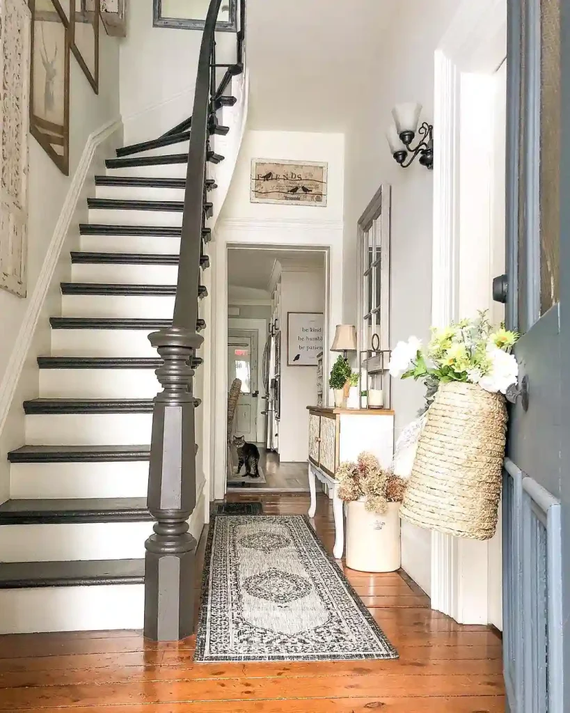 What makes it work: A showstopping staircase and vintage runner immediately establish character in this classic entryway. The contrast between dark wood handrails and light walls with white trim creates visual interest and dimension.