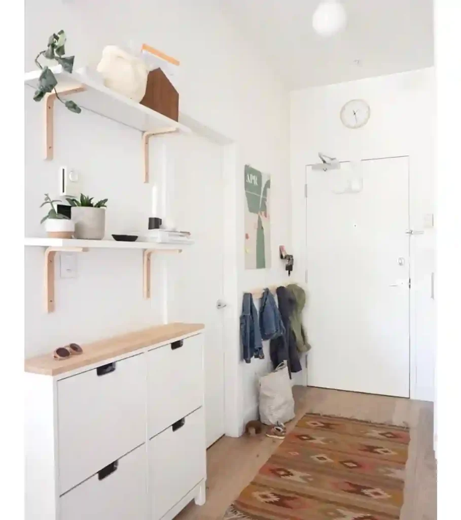 Small potted plants and neatly stored accessories maintain order without feeling sparse or cold. A slim rug adds warmth underfoot, while hooks positioned by the door offer easy access to jackets and bags.