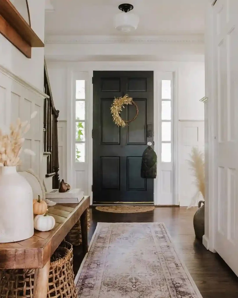 What makes it work: This cozy entryway blends modern black elements and classic white with warm wood tones for a timeless look. The black front door creates drama, while a dried wreath and neutral seasonal decor add charm.