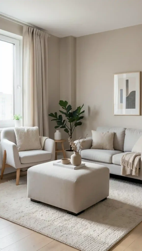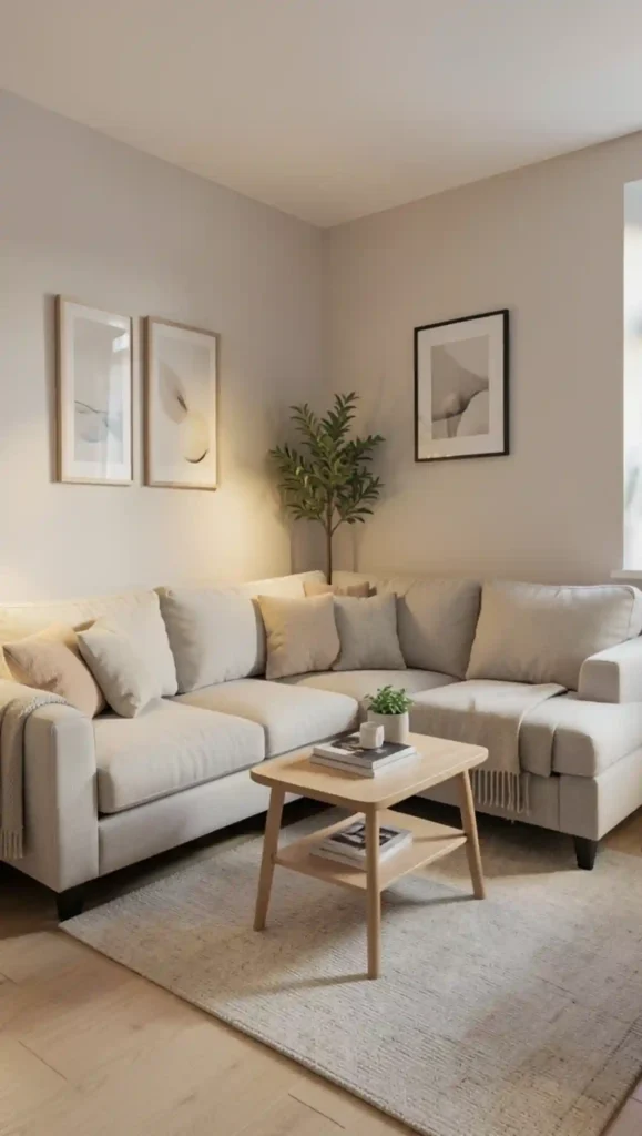 A light neutral palette instantly makes a small living room feel open. Soft whites, warm beige, and light greige reflect natural light instead of absorbing it. Keep the sofa simple, add a textured rug, and avoid heavy contrast. The goal here is calm and airy, not flat. When everything stays in the same light family, the room feels wider, taller, and more relaxed perfect for everyday living.
