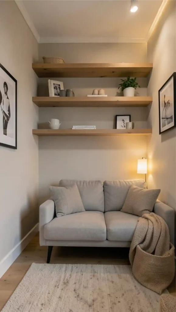 Floating shelves free up floor space while still giving you storage and style. In a small living room, they keep the layout visually light and uncluttered. Stick to a few shelves instead of crowding the wall, and style them simply with books, small plants, and framed art. This keeps the room functional without adding bulky furniture that can make the space feel tight.