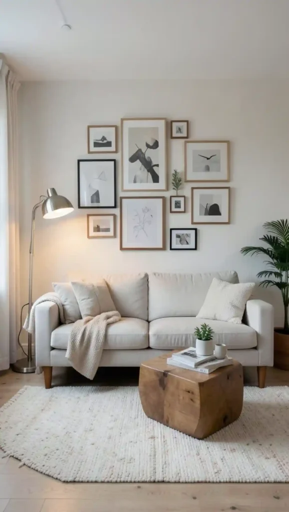A gallery wall adds character without using floor space. Keep frames consistent to avoid visual chaos. This works best when the rest of the room stays simple so the wall feels curated, not busy.