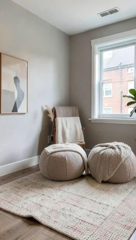 Poufs are casual, flexible, and easy to move. They work well for extra seating without committing to large furniture. This keeps the layout open and adaptable.
