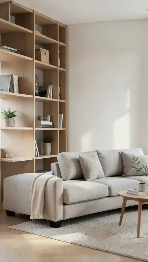 Japandi blends warmth with simplicity. Low furniture, natural materials, and neutral tones create a calm, grounded feel. This style works well in small living rooms because it avoids excess while still feeling cozy.