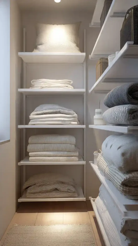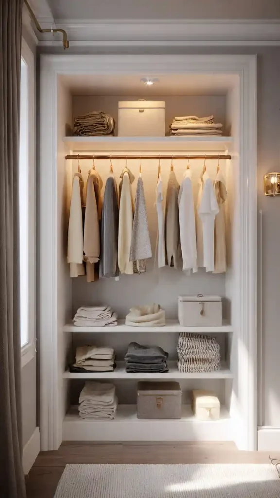 This dual-purpose solution saves wall space while adding depth to the room. Hidden storage helps reduce visual clutter, which is especially important in small spaces. When surfaces stay clear, the closet feels larger and more refined.