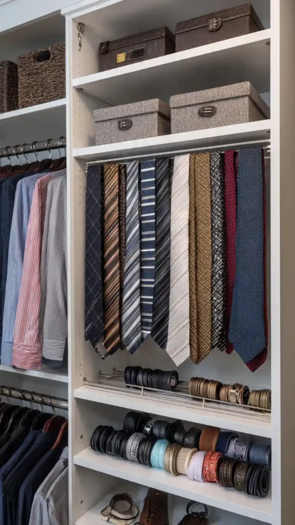 Accessories like belts and ties often end up tangled in drawers. A slim pull-out rack mounted inside a cabinet or along a wall keeps them visible and organized.