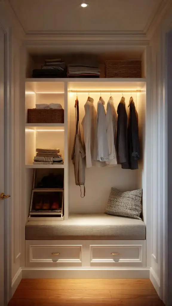 This idea works because it combines comfort and function. The bench anchors the space visually while adding concealed storage. In a small closet, multi-purpose pieces make a big difference.