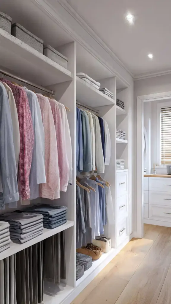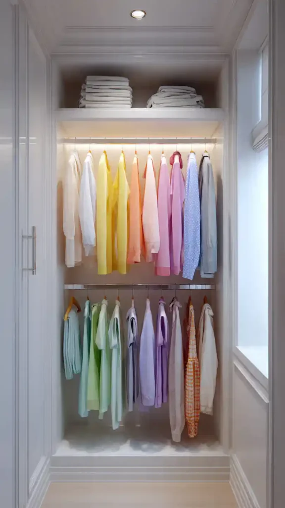 Arranging your clothes by color instantly makes a small walk-in closet feel more intentional. Instead of random groupings, organize garments from light to dark or by color families. This simple shift creates visual order and makes outfit planning faster.