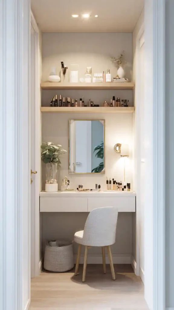 Even in a small walk-in, a slim floating shelf with a small mirror can create a compact vanity corner. Store daily jewelry, perfume, or makeup neatly in trays to keep the surface clean.