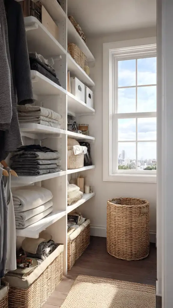 Corners are usually wasted space in small walk-in closets. Adding built-in corner shelving transforms that awkward area into useful storage for folded sweaters, handbags, or decorative baskets.