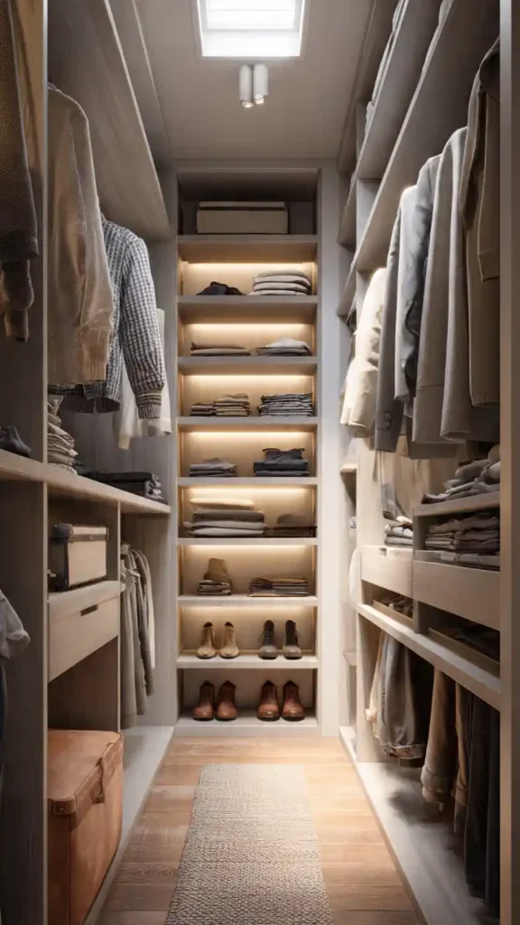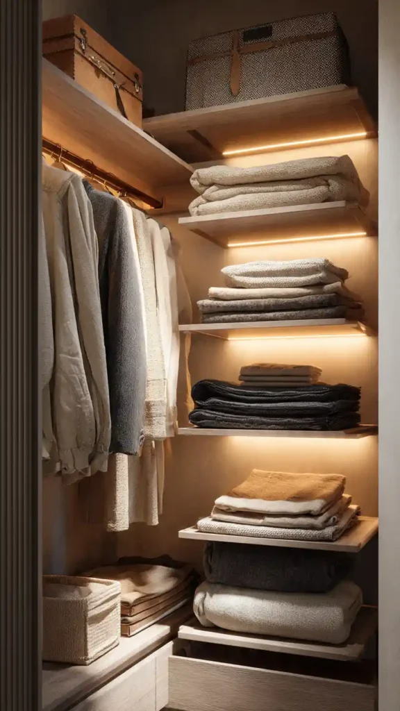 Lighting changes everything in a small walk-in closet. Installing soft LED strips under shelves improves visibility and adds warmth. It eliminates shadows and makes it easier to see darker clothing.