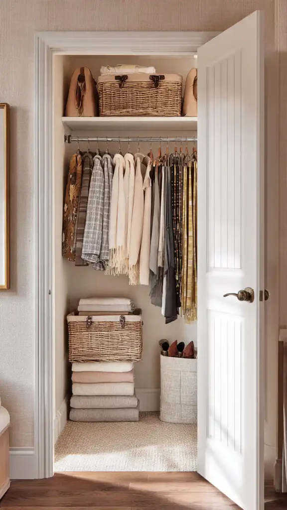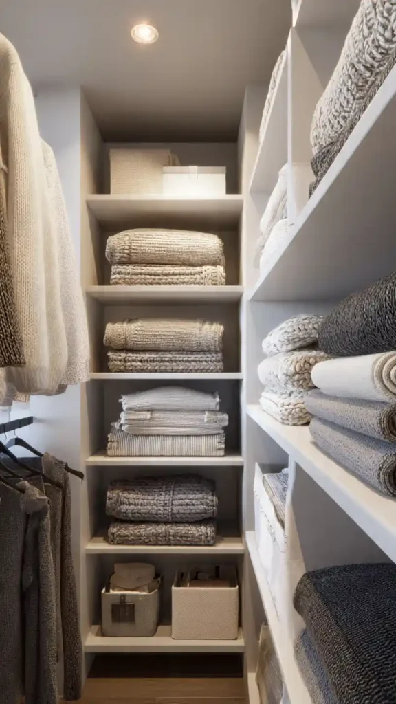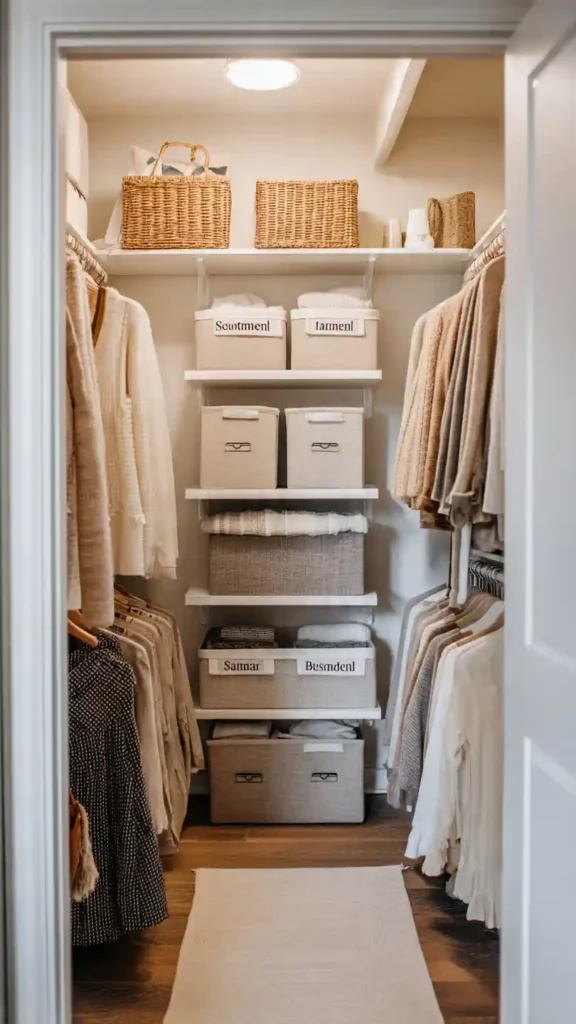 Designate one shelf or labeled bin for off-season items. When the weather changes, rotate clothing instead of storing everything at once.
