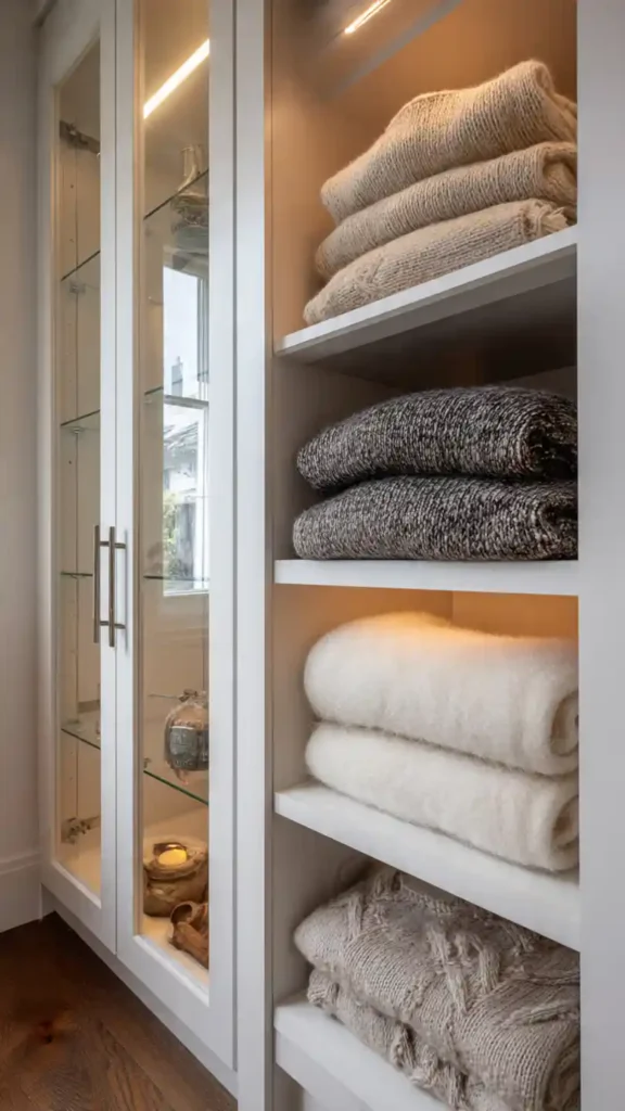 Adding one glass-front cabinet elevates the entire closet. Use it to display neatly folded sweaters or curated accessories. The transparency keeps items visible while protecting them from dust.