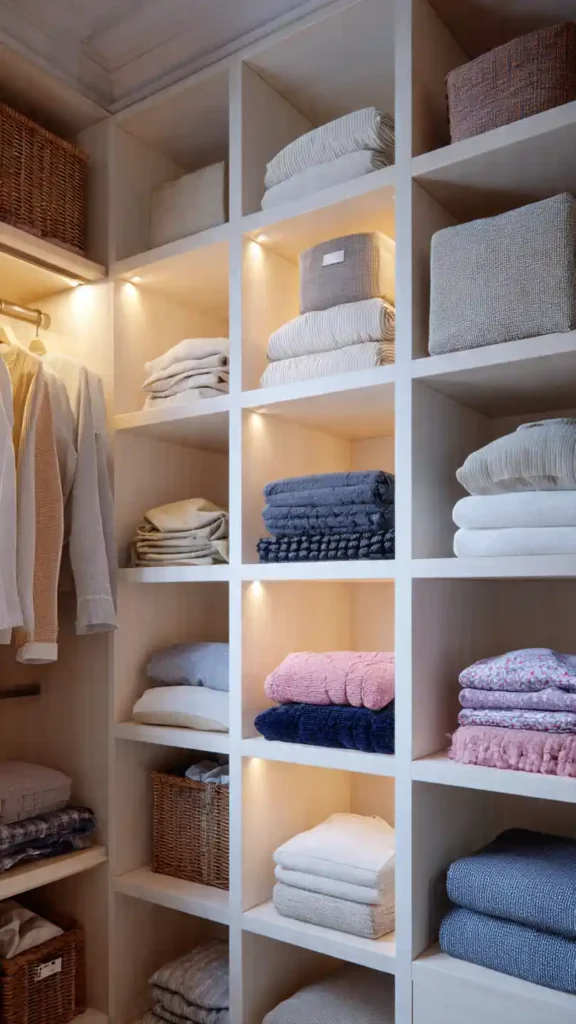 This solution works well in rental spaces or builder-basic closets. It adds structure instantly and prevents stacks from becoming messy. Because the cubes are lightweight, they keep the closet feeling open rather than heavy.