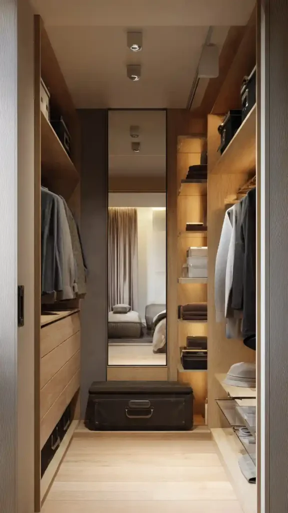 A small walk-in closet feels more functional when it includes a defined dressing area. Add a full-length mirror along one wall and place a small stool or basket beneath it. This creates a simple styling zone where you can check outfits comfortably.