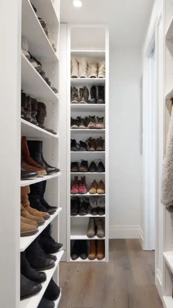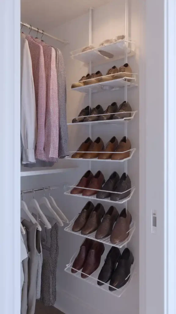 Shoes can easily take over a small walk-in closet, especially when they’re lined up along the floor. Installing slim vertical shoe shelves keeps everything visible without eating up valuable square footage. Instead of spreading shoes horizontally, you’re stacking them upward which makes the entire space feel taller and more organized.