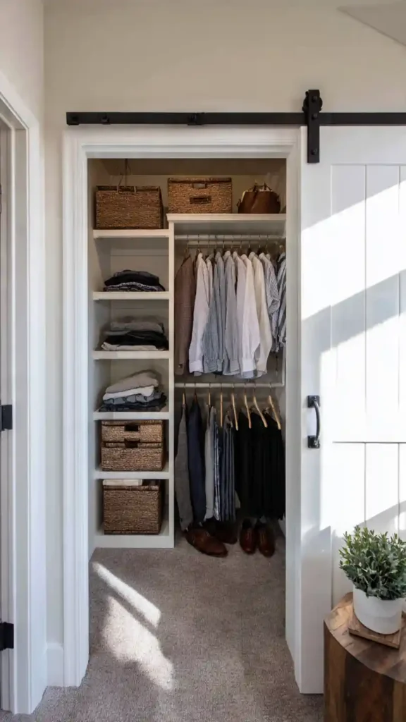 If your small walk-in has a traditional swinging door, it may be wasting usable space. Switching to a sliding barn-style door frees up the entry area and makes the closet easier to access.