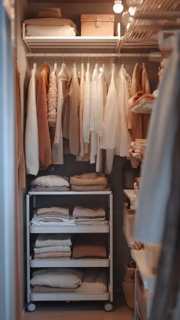 A narrow rolling cart can completely change how your small walk-in functions. Use it to store everyday items like folded tees, accessories, or perfume. When you need extra space, simply roll it aside.