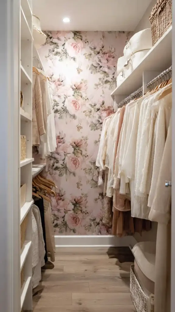 Adding wallpaper to the back wall transforms a small walk-in from purely functional to visually styled. Choose a subtle floral, soft stripe, or textured neutral pattern to add depth.