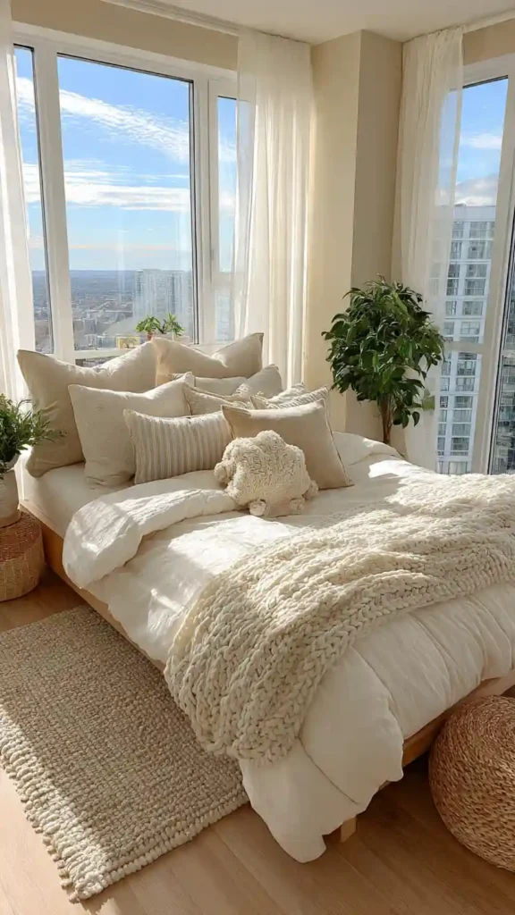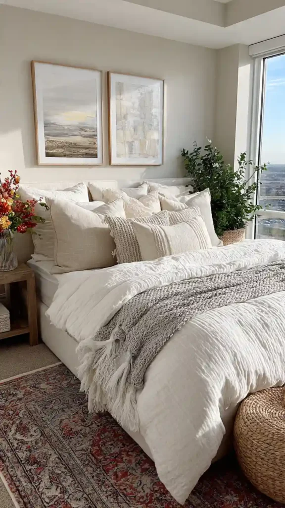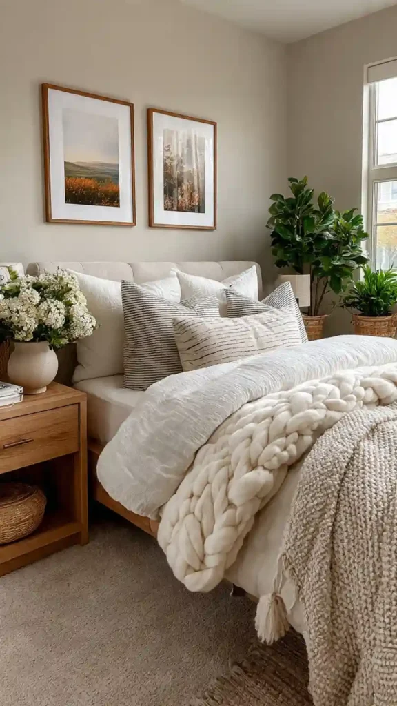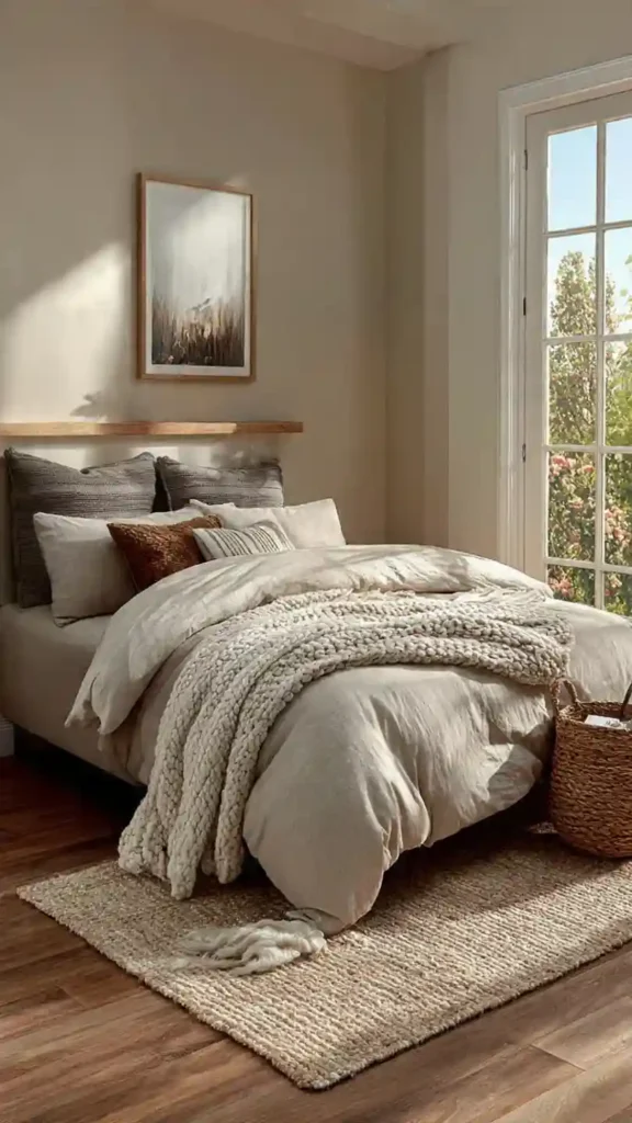 Cozy textiles add warmth and comfort to this spring bedroom while keeping the look light. Layered throws and neutral tones create a welcoming atmosphere. Soft daylight balances the textures, ensuring the space feels fresh rather than heavy. This style is perfect for blending comfort with seasonal freshness.