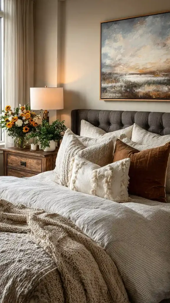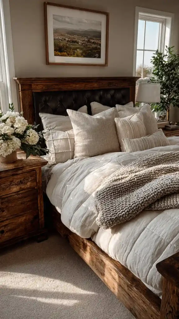 Layered bedding adds comfort and warmth while still feeling light enough for spring. Neutral tones keep the look soft, while different textures add depth and interest. Natural light helps balance the cozy layers so the room doesn’t feel heavy. This style is ideal for those who want a spring bedroom that feels inviting and relaxed rather than minimal.