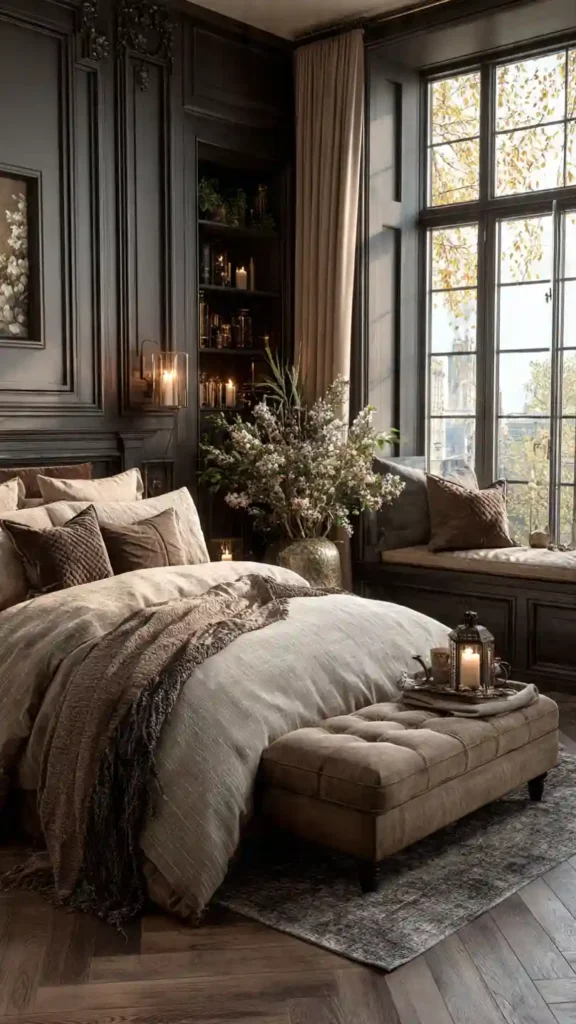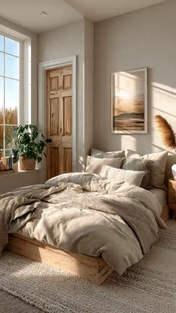 A warm neutral palette makes this spring bedroom feel comfortable and inviting. Textured bedding and soft lighting add depth while keeping the space light. The overall look feels balanced and relaxed, perfect for spring. This style works well if you want a cozy feel without dark colors.