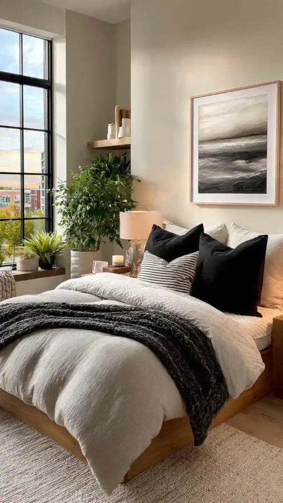 This modern spring bedroom uses subtle contrast to add interest without feeling heavy. Light walls and bedding are balanced with slightly darker accents, keeping the space clean and stylish. The overall look feels airy and calm, making it perfect for spring. Simple furniture and minimal decor keep the focus on balance and comfort.