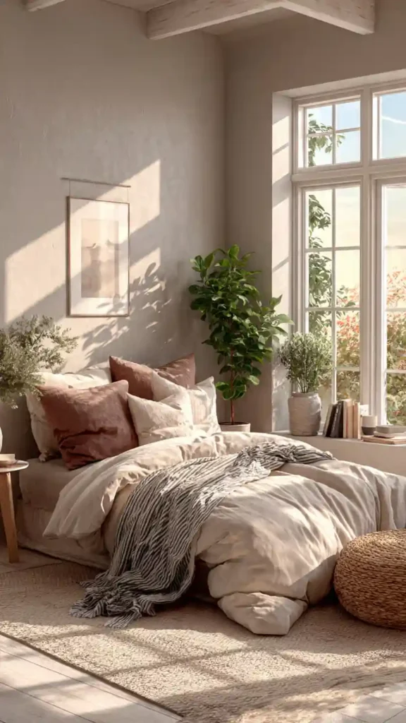 Soft pink accents add warmth and a gentle spring feel to this bedroom. Paired with white bedding and natural daylight, the space feels light and welcoming. The pink tones are subtle enough to keep the room calm while still adding a seasonal touch. This look feels modern, cozy, and easy to refresh year after year.