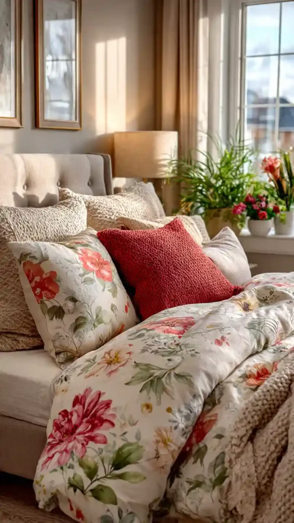 Floral-patterned bedding adds a subtle seasonal touch without overwhelming the room. Paired with light neutral walls and soft daylight, the look feels cheerful and balanced. The floral design brings personality while keeping the space cozy and inviting. This is an easy way to refresh a bedroom for spring without changing wall colors or furniture.